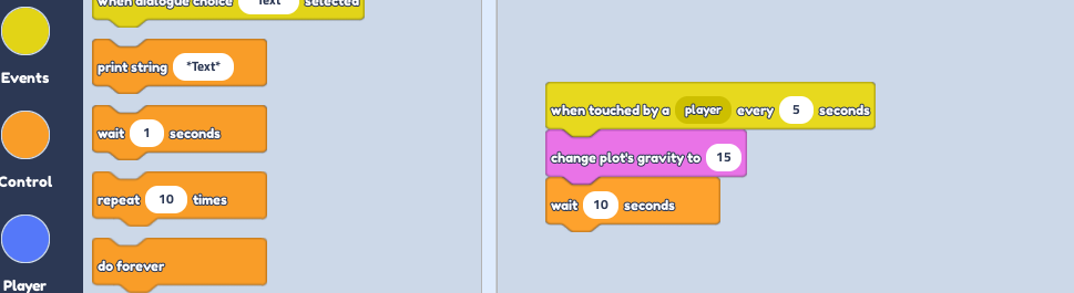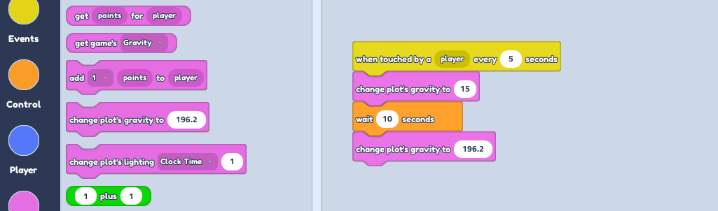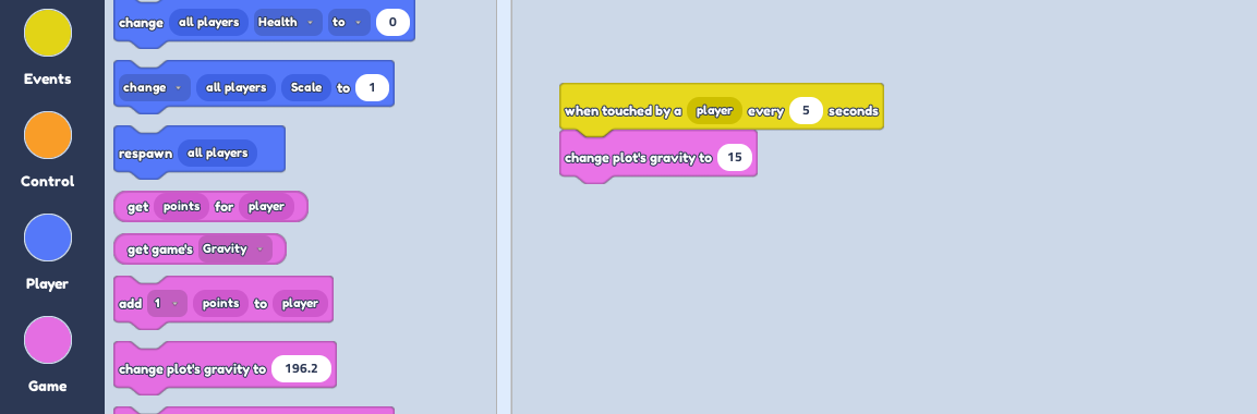 Events, start with aWhen player touches object, followed by achange plot's gravity to --part from theGameSection. Change the number to 15 or whatever number you'd like. The lower the number, the less gravity.