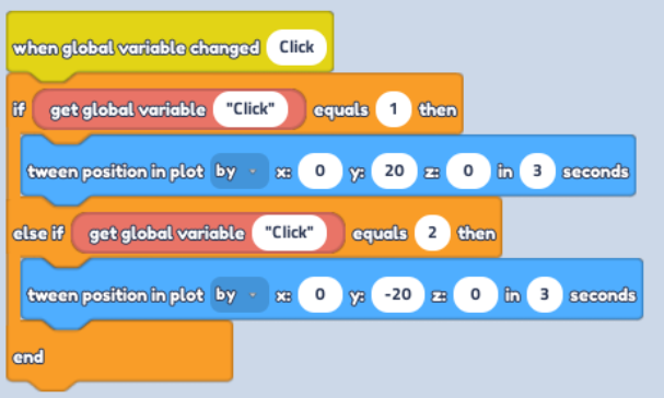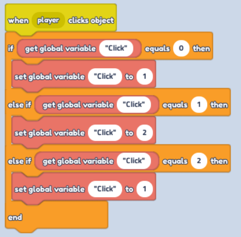 Replace the first "Text" in Code Block "If...Equals..." with "Get global Variable" in "Variables" (Red Button), change text to "click" and "Equals" value to 1