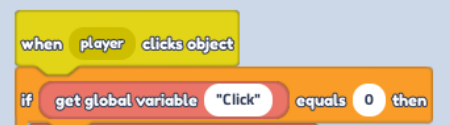 Replace the first "Text" in Code Block "If...Equals..." with "Get global Variable" in "Variables" (Red Button), change text to "click" and "Equals" value to 0