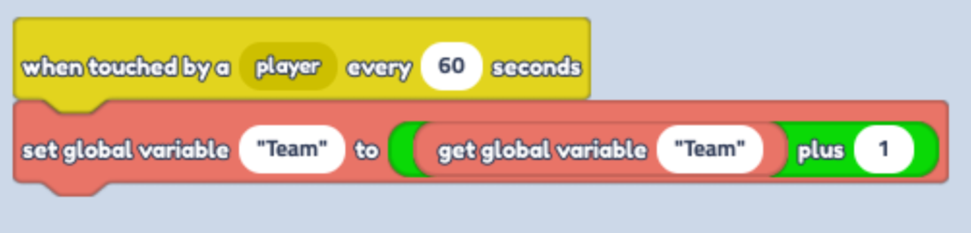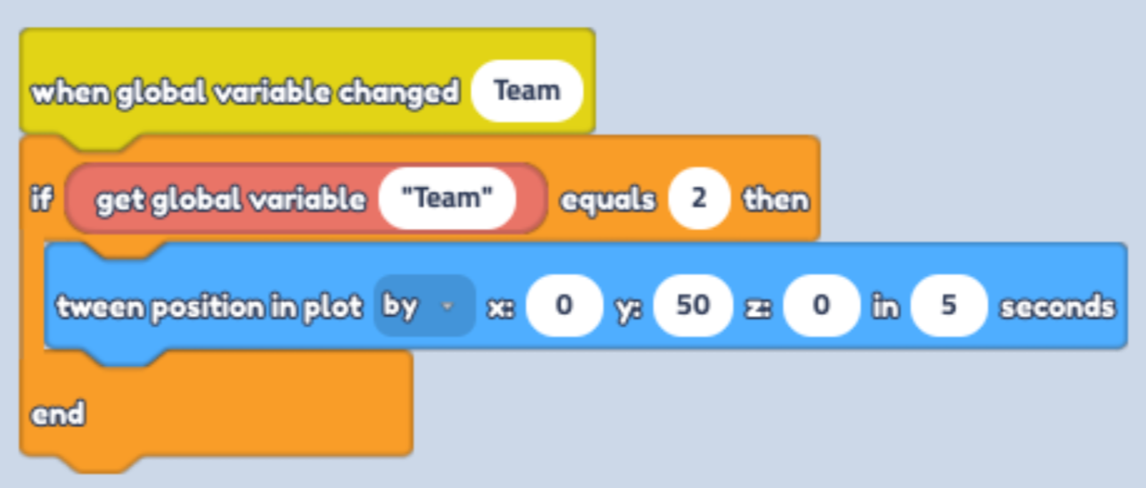 Find "Get global Variable" and place it in between of "if" and "Equals", change text to "Team". Change "Equals" value to 2