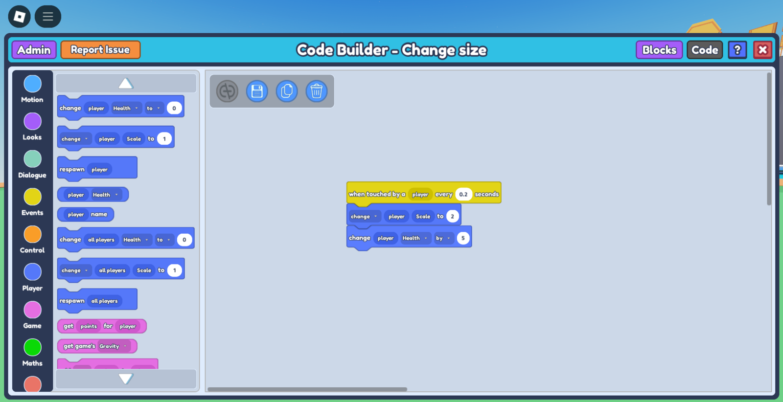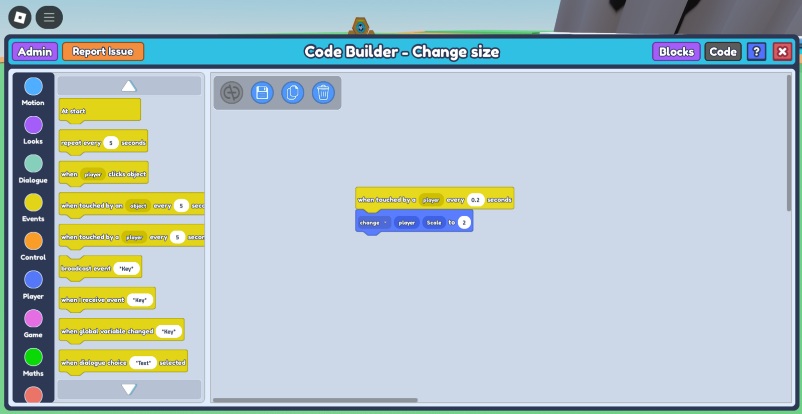 - Select the object you'd like to be the trigger for the player's change in size. After selecting the object, select the Code Builder button on the toolbar. This should open a 'Properties' tab with the options, 'Save' and 'Code Builder'. Press 'Code Builder'. This should lead you to the Code Builder tab.