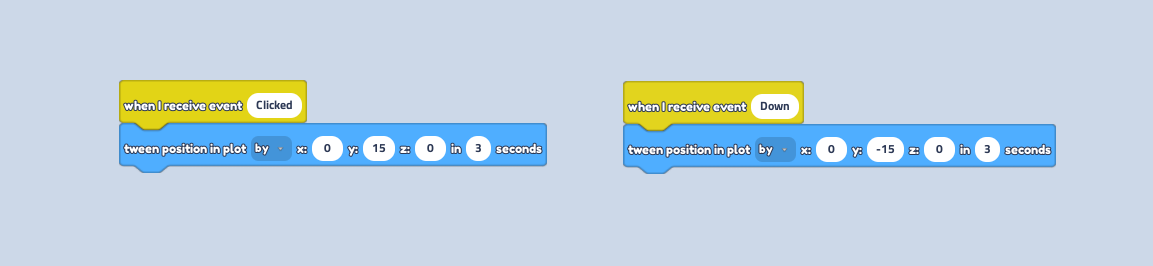 when I receive eventblocks, with your trigger words in each one. After both, place 2tween object position in plotblocks from Motion. In the Y put a ${color}[#00a814](positive number for Up), and a ${color}[#a80000](negative number for Down.)