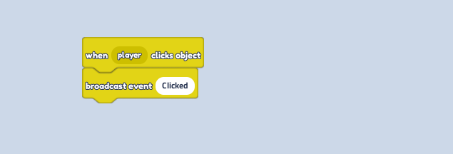 at startblock and abroadcast eventblock from Events. In the key, type your trigger word, in this example its "Clicked".