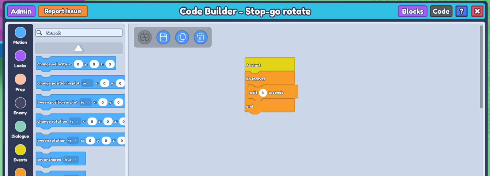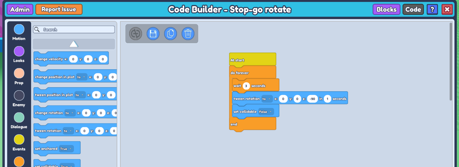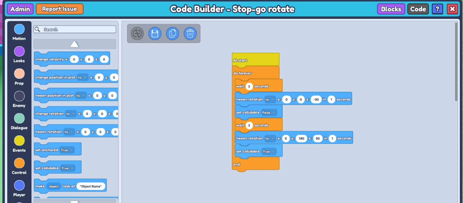 tween rotation to x : - y : - z : - in -- seconds, place it belowwait -- seconds. Input the position values of your 'danger' side in the x, y, and z.From 'Motion', grab set collidable True, and set it to False.