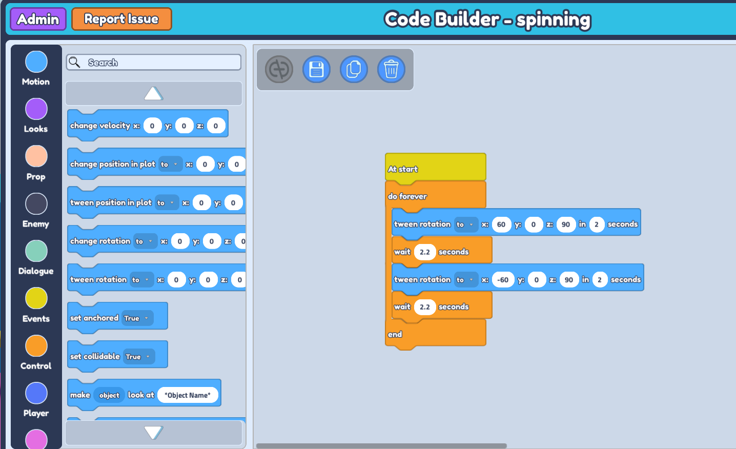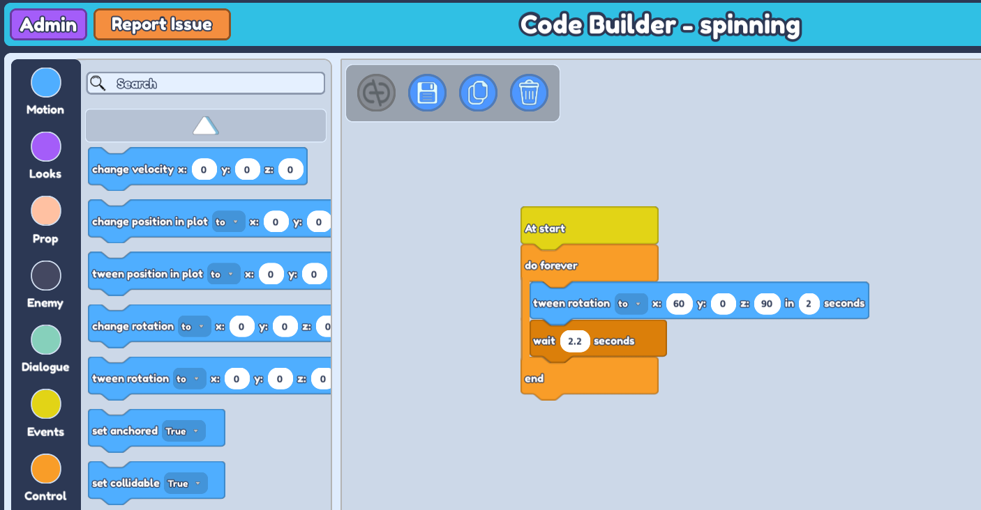 wait -- secondsblock and place it inside doforeverandend. Then, go to 'Motion' on the left side and grabtween rotation to x : 0 y : 0 z : 0 in -- seconds. This block will animate and control the swing of your object. Place it in between doforeverandend, abovewait -- seconds.Since we're rotating to certain coordinates, we want to get the correct rotation coordinates. So go to your plot and check the rotation axis of your pendulum by selecting your pendulum and rotating it to the amount you want for it to be at its full swing.
