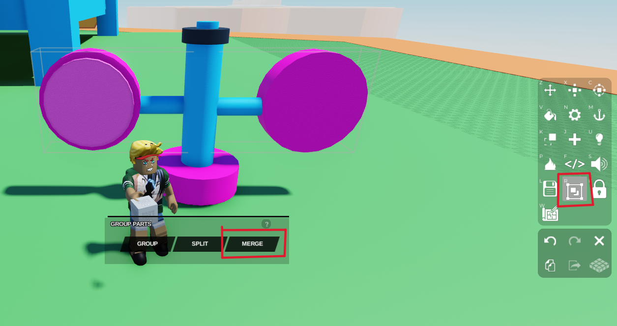 5. Now select our merged object and go to Code Builder by clicking the </> button on the right toolbar and pressing the 'Code Builder' button. Name your script and code.