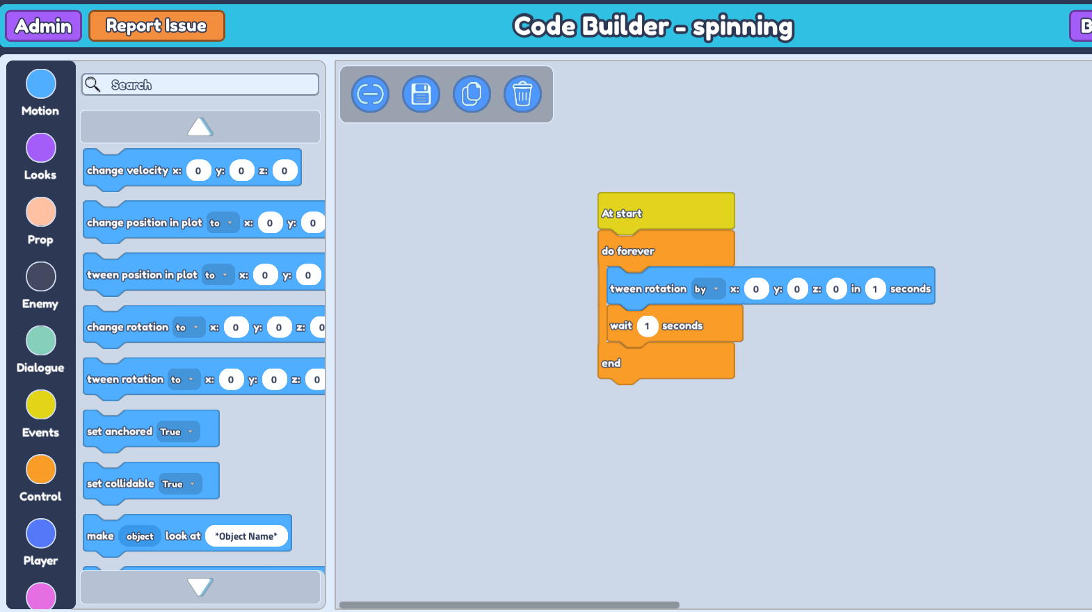 tween rotation to x : 0 y : 0 z : 0 in -- secondsblock. Change thetween rotationblock's 'to' to 'by' in order to rotate the object by a certain amount instead of to a certain location. Place this block in betweendo foreverandend, just abovewait -- seconds.