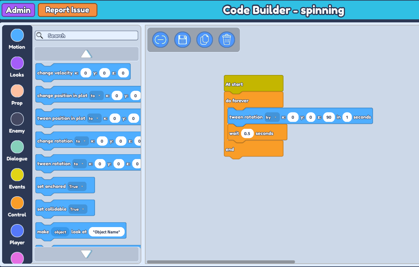 At startblock so your objects will start rotating as soon as you press play. Then go to 'Control' and grab thedo foreverblock and await for -- secondsblock. Place these blocks below yourAt startblock. Place yourwait -- secondsblock in betweendo foreverandend.Now go to 'Motion' and grab the