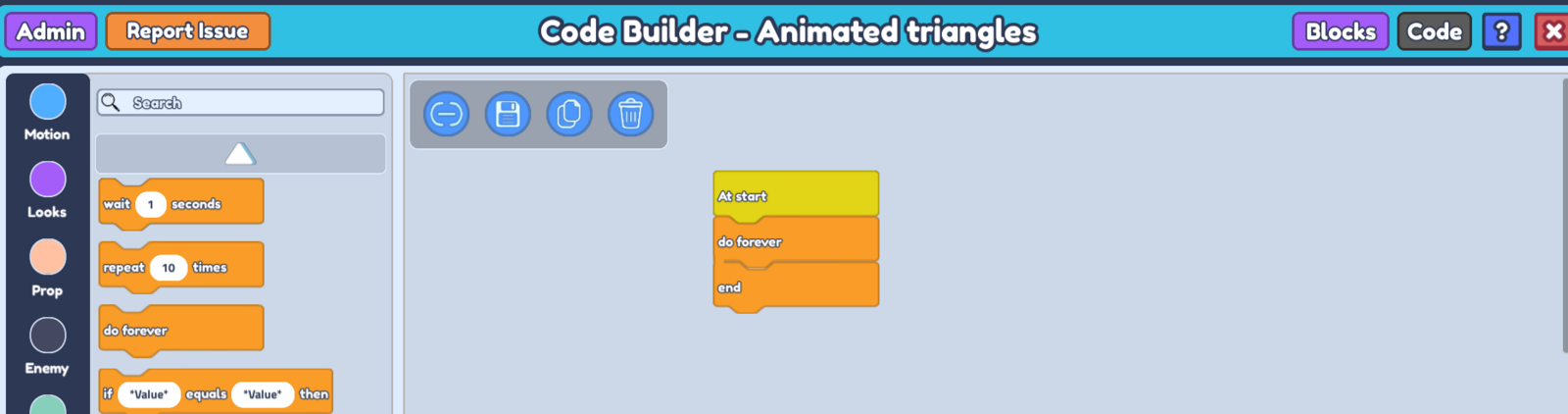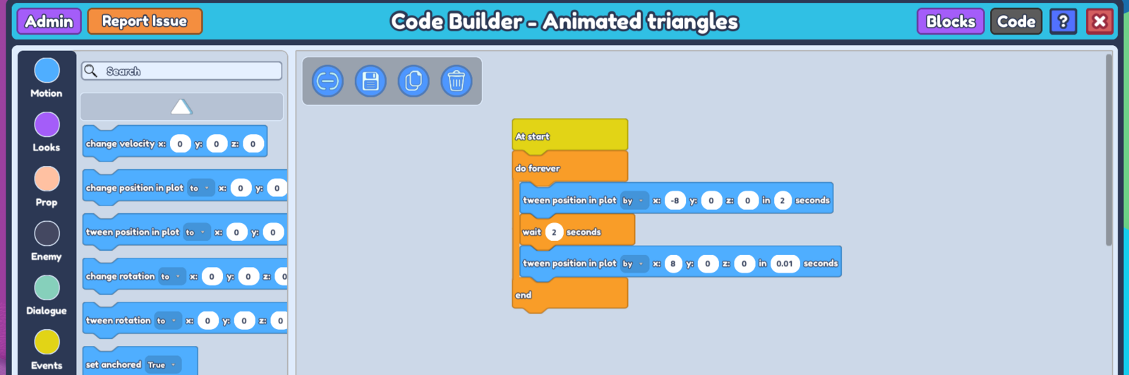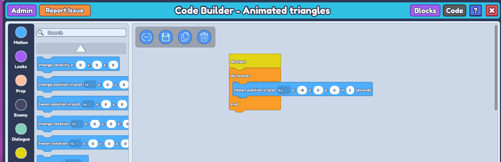 Open that object's Code Builder by clicking the </> button on the right toolbar. Now we're going to animate it.