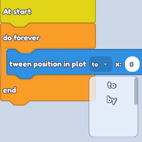 8. Go to 'Motion' on the left and grab tween position in plot to x : - y : - z : - in -- seconds. Change ' to' to ' by', and place it in between do forever and end.