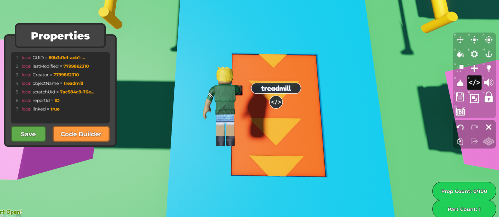 - Save your code, and close the Code Builder for that object. Now in your plot, select your treadmill block, and open Code Builder.
