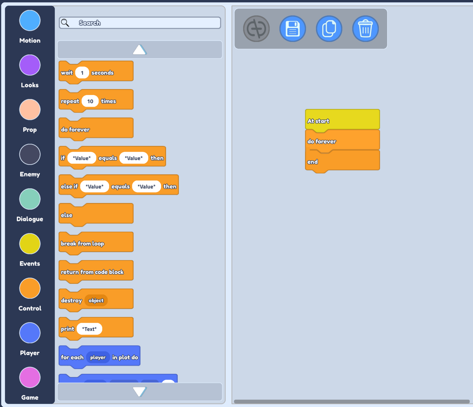 - We want our object to start moving as soon as the game starts, so let's look at our Events blocks and drag our At start block into the scripting area.