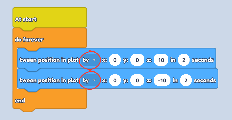 - Make sure to set your tween option to by. This makes sure we move by 10 from the current position instead of moving to position x:0, y:0, z:10.