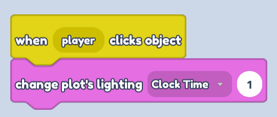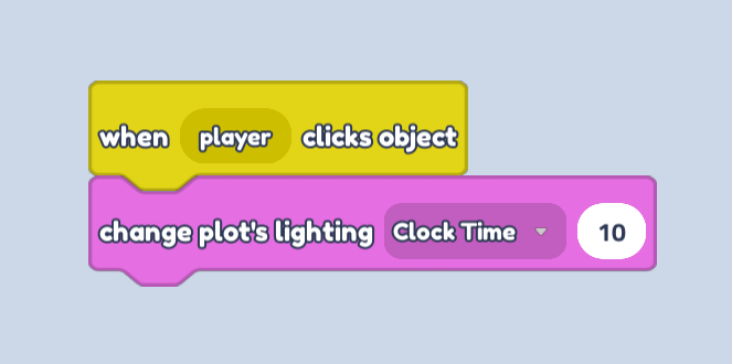 - Now we can drag the change plot's lighting block under our when player clicks object block. Let's set the clock time to 10, so that the lighting changes to day time when we click this button!