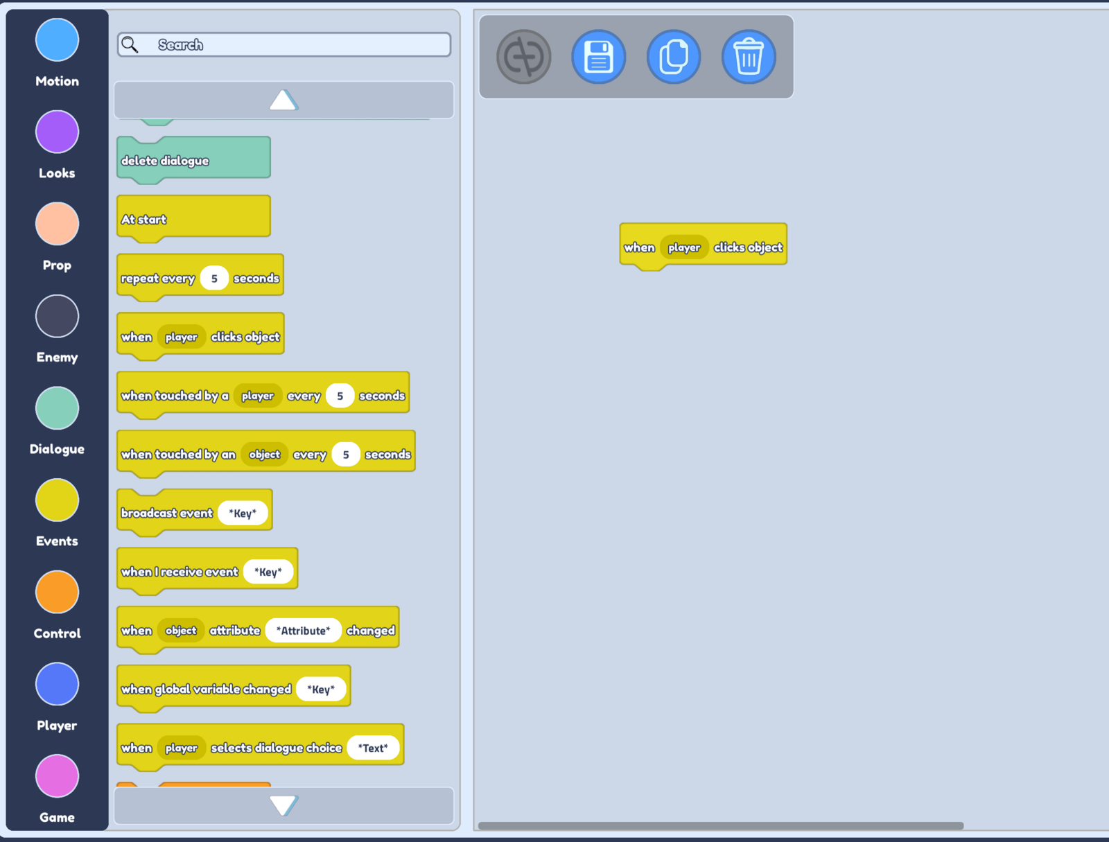 - Firstly, we need know when the player clicks this button. So let's open up our Events blocks and drag a when player clicks object block into our scripting area. This will activate every time the player clicks on this part!