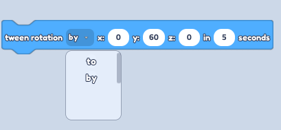 - Find the "Tween rotation" block in the "Motion" blocks section and change it to "By"