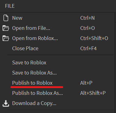 - Select "File" in the top right corner -> Publish to Roblox.