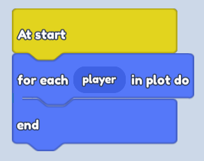 Find "At start" in Events (Yellow Button) and then find "For each player in plot so" in Player (Navy button) and connect them!