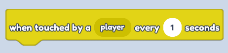 - Find "When touched by a player" in Events (Yellow Button) and change seconds to 1